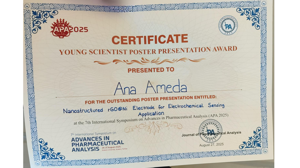 The team’s research received notable recognition, with the poster titled “Nanostructured rGO@Ni Electrode for Electrochemical Sensing Application” awarded the Outstanding Poster Award by the Journal of Pharmaceutical Analysis.
